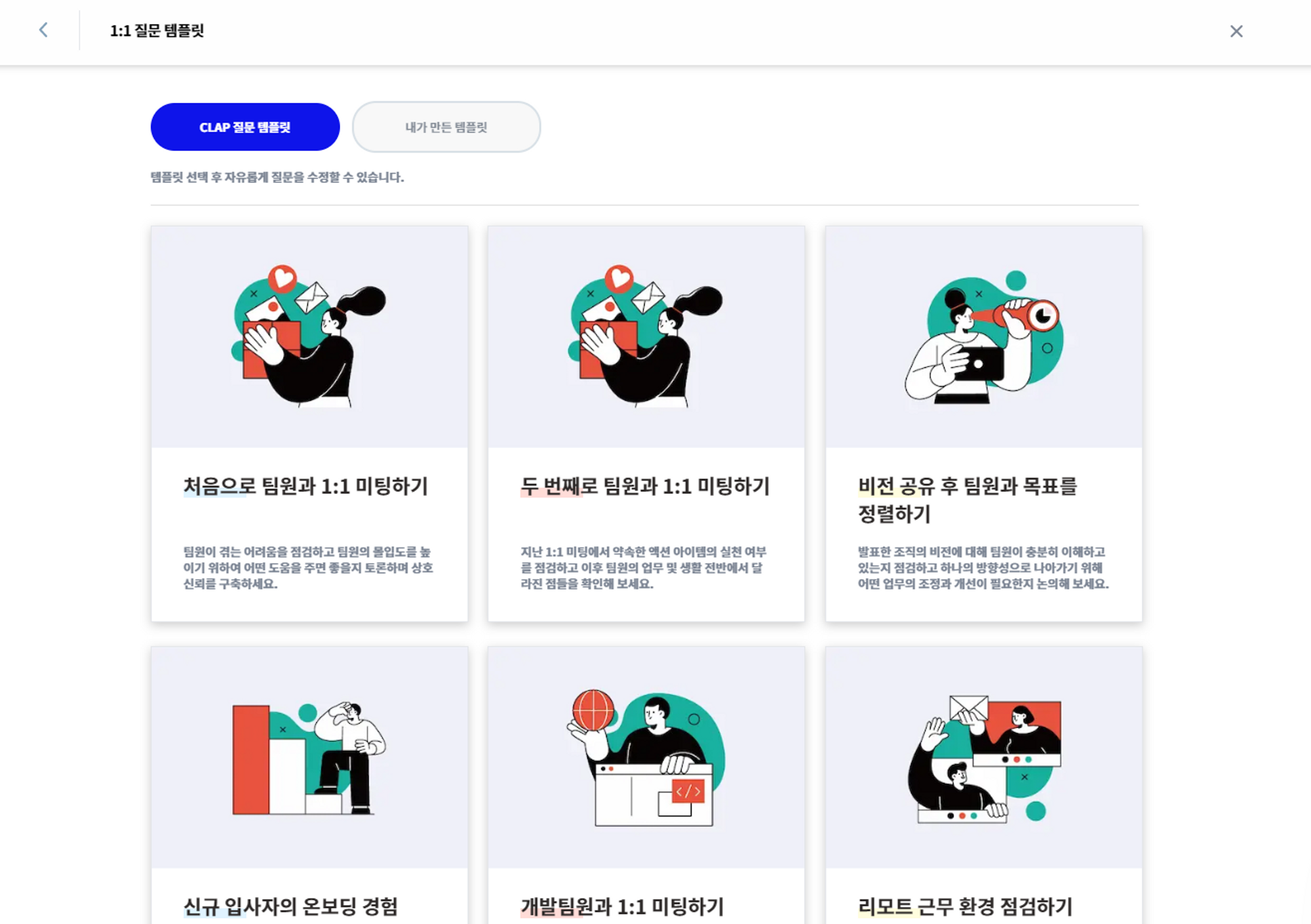1대1미팅(1on1)을 손쉽게 시작할 수 있도록 도와주는 클랩CLAP을 무료로 사용해보고 싶으시다면? 아래 버튼을 클릭해주세요!