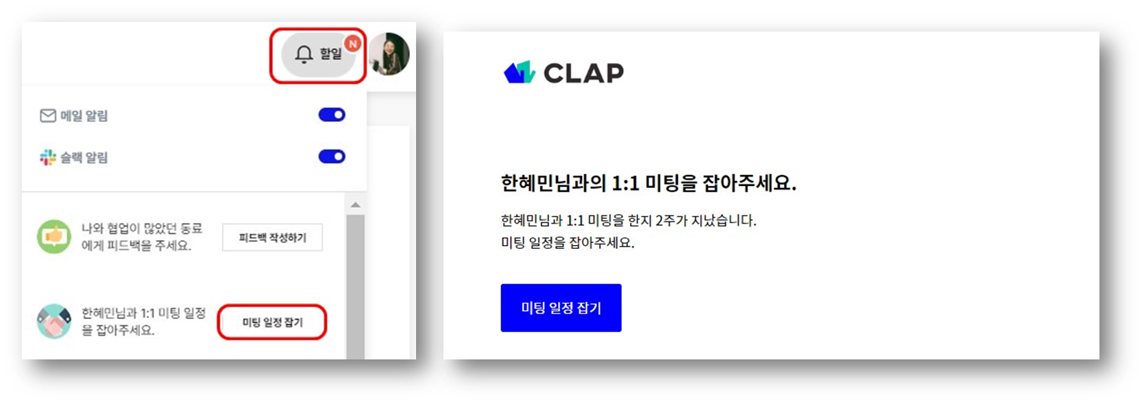 정해진 주기에 잊지 않고 1on1 미팅을 진행할 수 있도록, 클랩이 알려드릴게요.