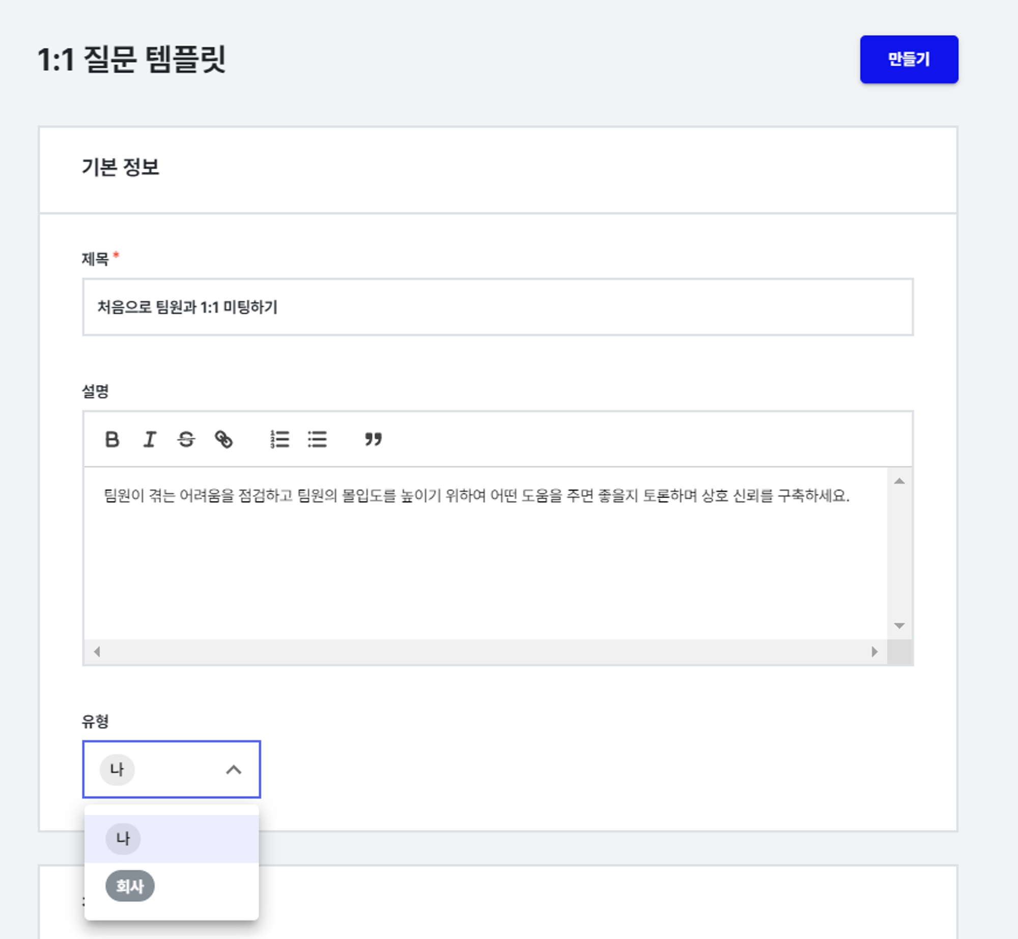 멤버들에게 공통으로 사용할 수 있는 나만의 질문 템플릿을 미리 생성해두면 1on1 미팅의 준비 시간을 획기적으로 줄일 수 있어요. 1on1 미팅을 진행해야 하는 멤버가 많은 매니저분들께서는 ‘나만의 템플릿 만들기’ 기능을 꼭 한번 활용해보세요.