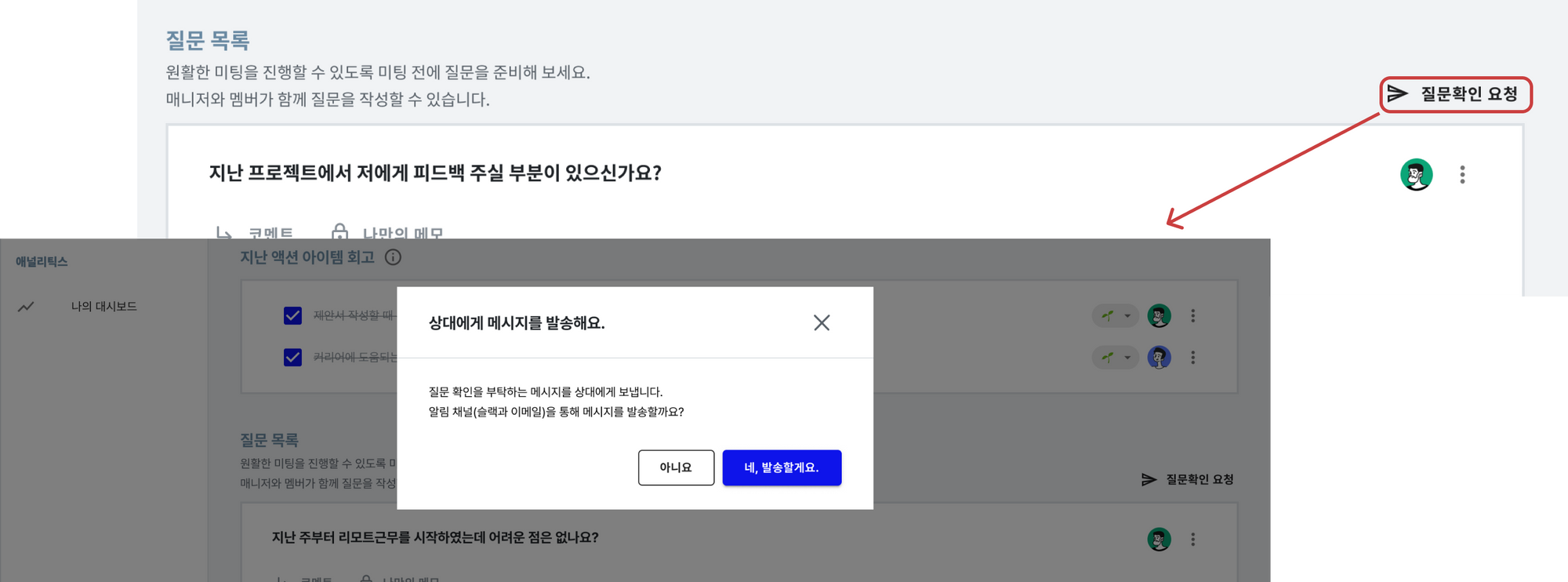 만약 질문을 작성하신 뒤 상대방에게 질문을 확인하도록 알림을 주고 싶다면 '질문확인 요청' 기능을 활용해보세요! 슬랙 및 이메일로 질문 확인 알림이 발송됩니다.