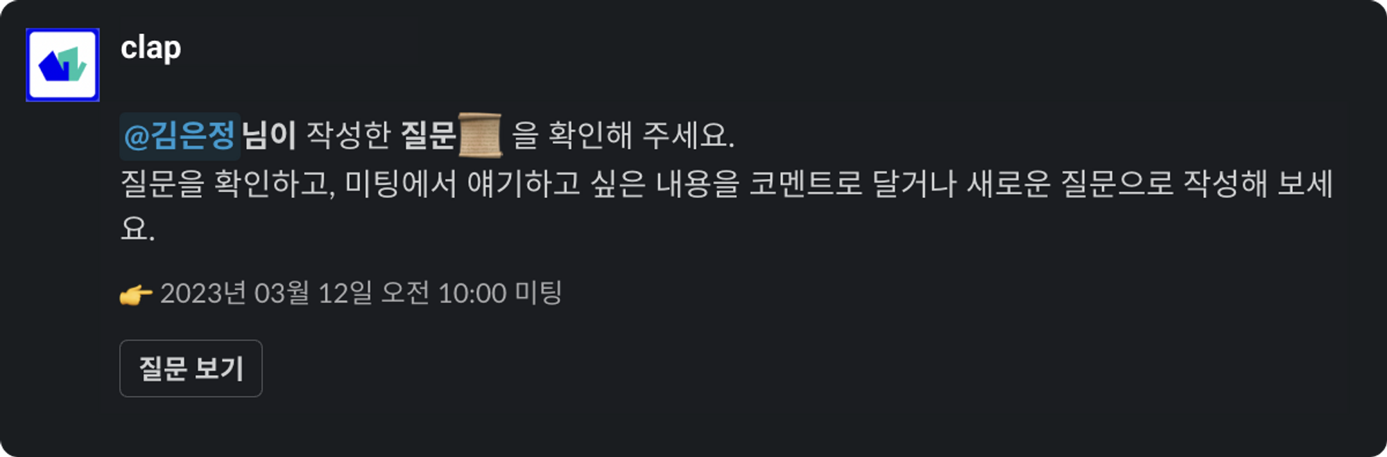 클랩에서 1:1 미팅이 생성되면 매니저, 멤버 모두 질문을 등록할 수 있어요. 1on1 미팅이 생성되었음을 알려주는 슬랙 알림을 통해서도 ‘질문 작성하기’ 페이지에 바로 접속 가능하기에, 바쁜 업무 중에도 1on1미팅을 효율적으로 준비할 수 있어요.
