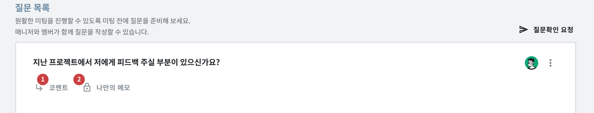 매니저-멤버 모두에게 공개되는 '코멘트'는 각 질문별로 여러 개를 생성할 수 있는데요, 미리 등록된 질문을 확인하고 이에 대한 각자의 의견을 코멘트로 작성해둔다면 1on1을 진행하기 전에 코멘트 내용을 미리 확인하고 전반적인 1on1 미팅의 흐름을 파악할 수 있습니다.