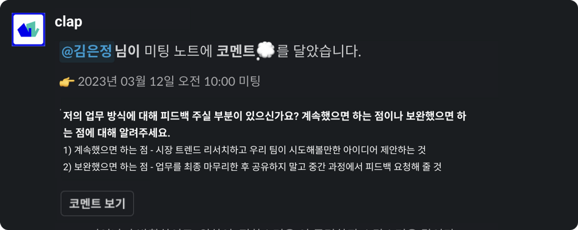 Tip) 코멘트가 등록되면 슬랙(Slack)으로 알림을 보내드려요! 알림을 받은 뒤 상대방이 등록해둔 코멘트를 미리 확인해보세요.