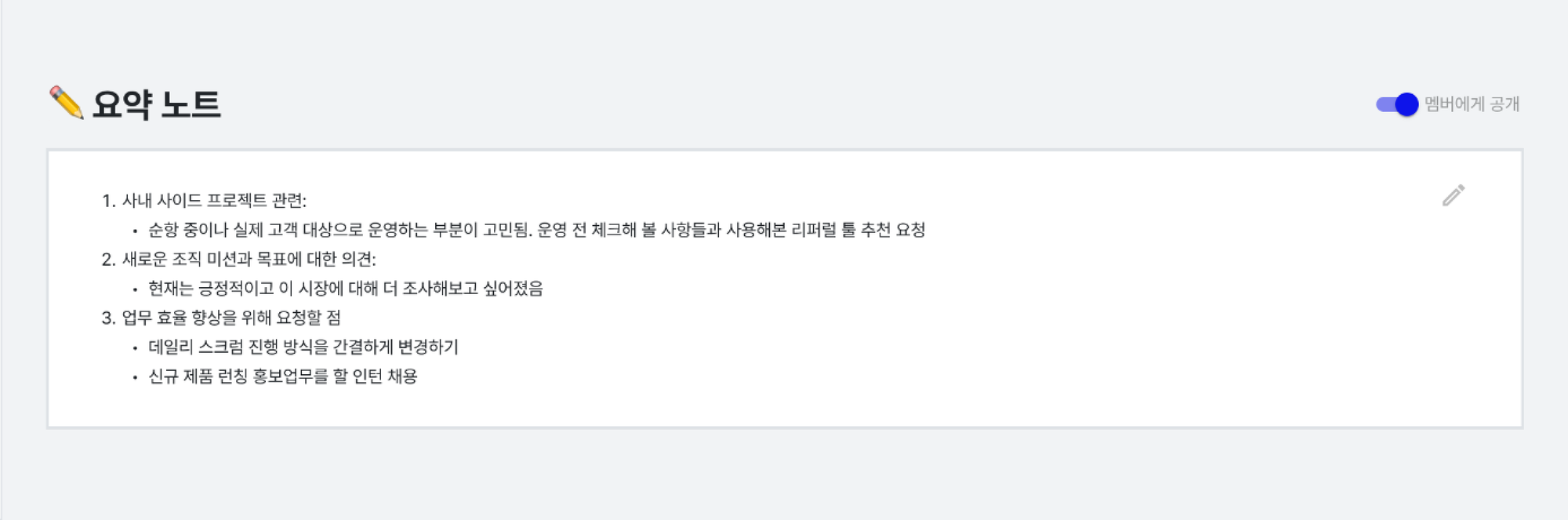 요약 노트에 1on1 미팅을 통해 협의된 내용 혹은 1on1 미팅의 큰 주제 등을 요약해서 적어보세요. 이를 통해 매니저와 멤버 간의 싱크를 맞출 수 있을 뿐 아니라, 1on1 기록의 큰 줄기를 파악할 수 있다는 점에서 유용하답니다.