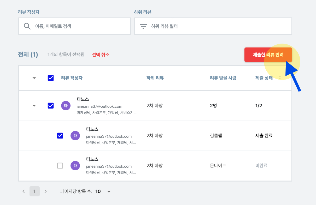 구성원이 이미 제출한 평가를 다시 작성하고 싶다고 요청하거나, 평가 완료 후 재작성이 필요하다고 판단되는 경우도 종종 발생합니다. 이럴 때는 클랩의 <제출 반려> 기능을 활용해 보세요.