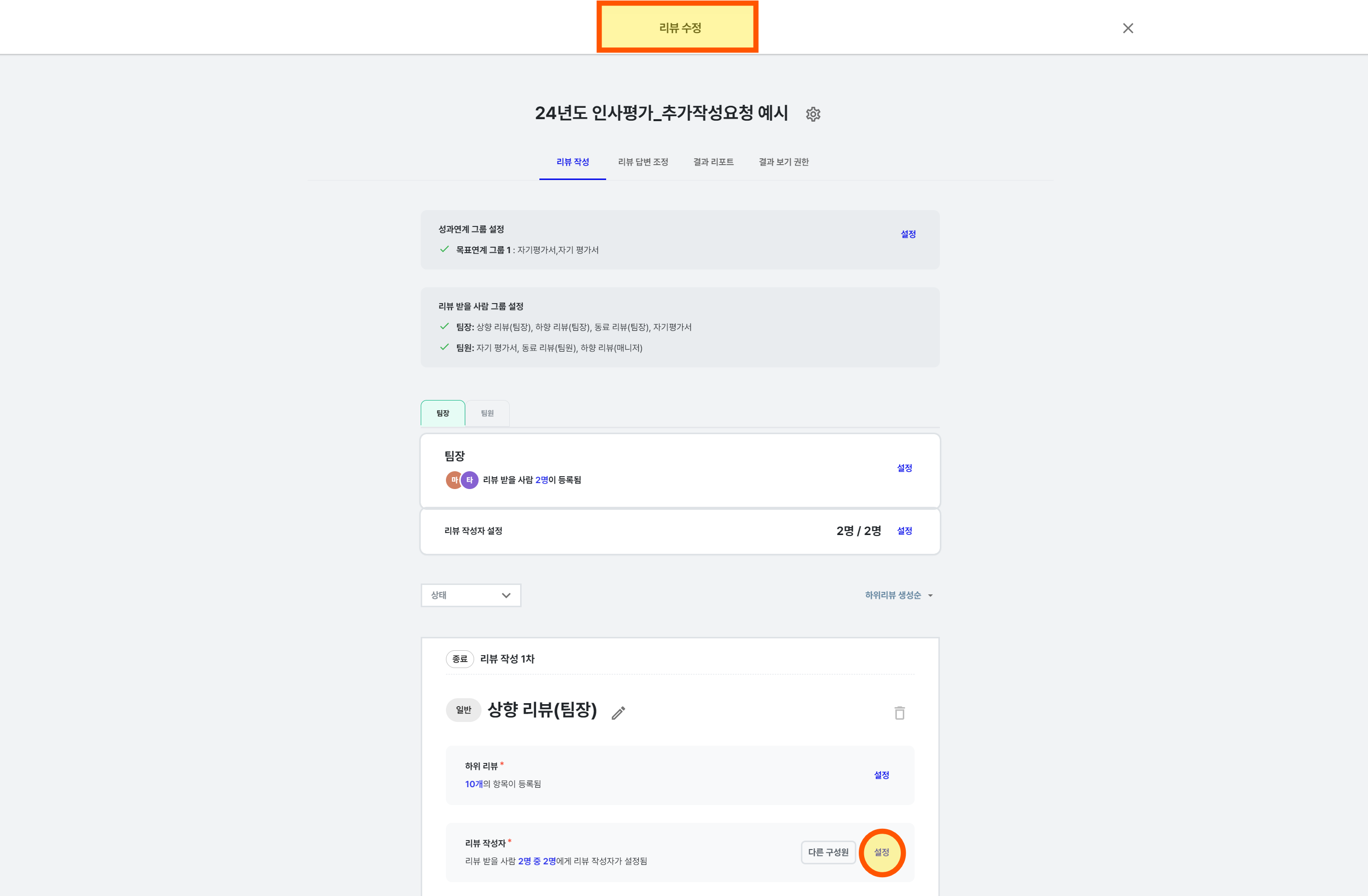 작성 단계가 지난 리뷰에 대해서도 재작성 요청이 가능하며, 각 평가자별로 개별적인 평가 마감일을 설정할 수도 있습니다.