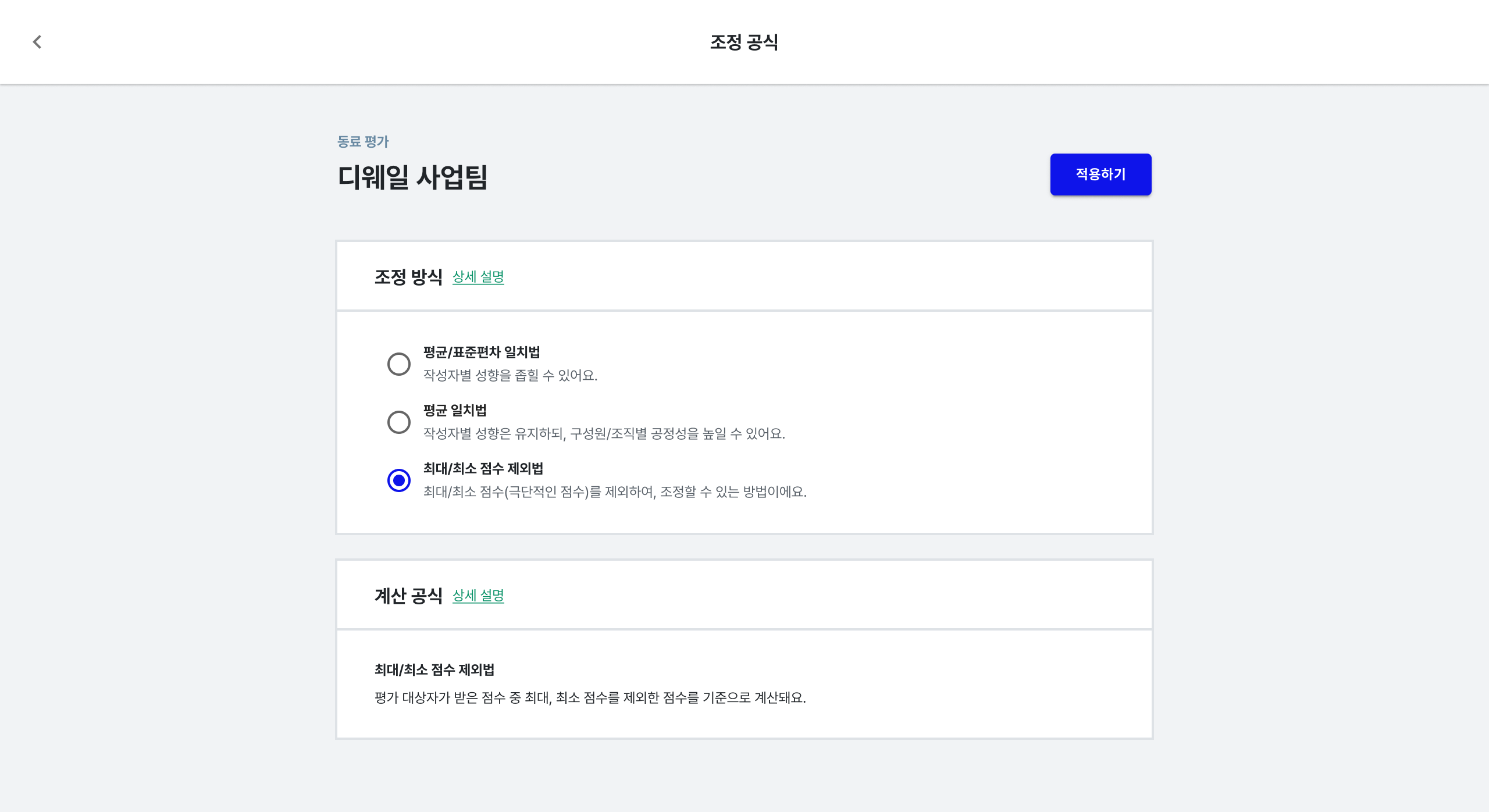 • 결과: 극단적인 점수를 제외함으로써, 보다 공정하고 객관적인 최종 평가 점수를 도출할 수 있었습니다. 평가자 간 점수 편차로 인해 발생하던 불만도 감소했습니다.