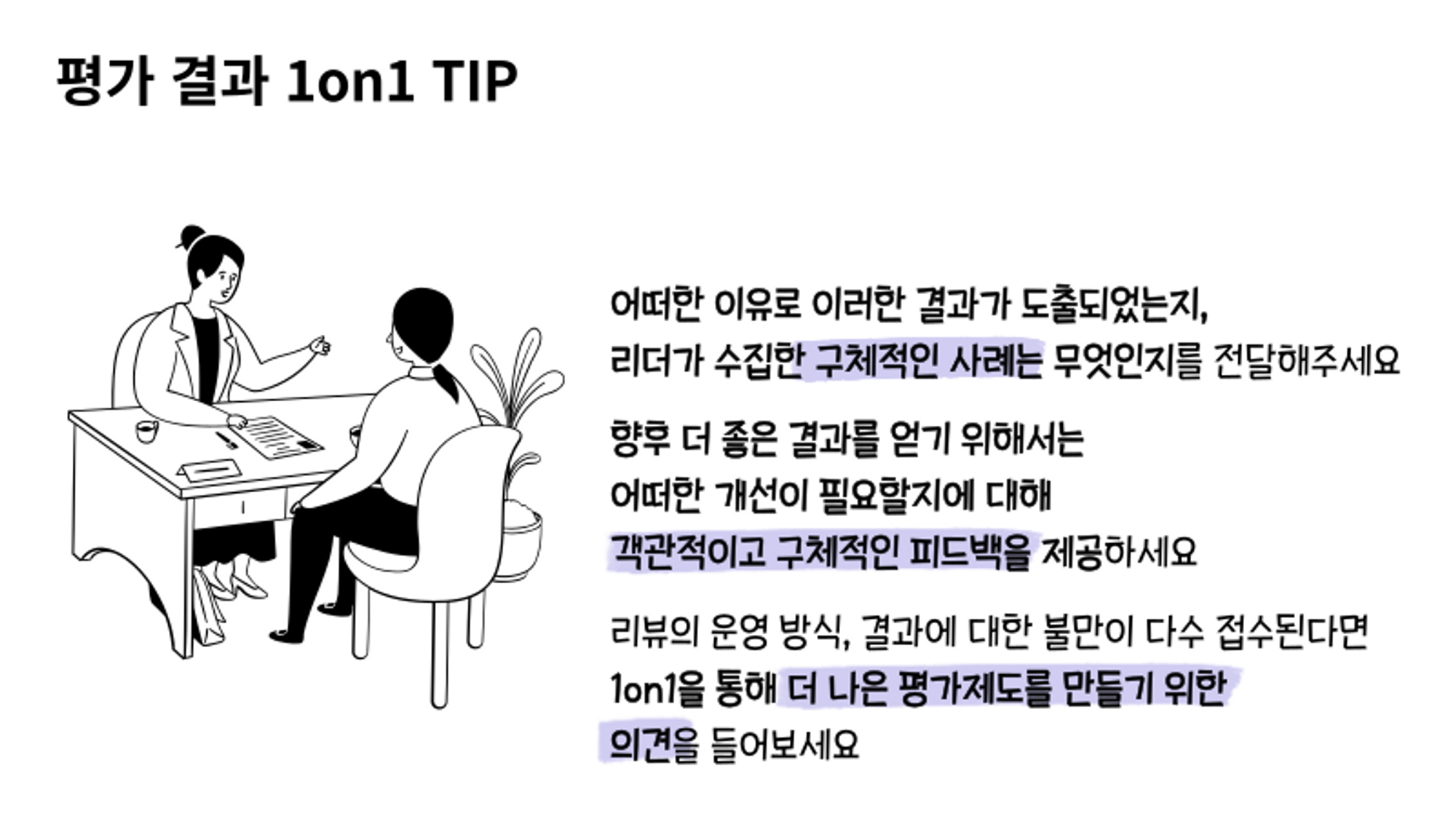 평가 결과를 1:1 면담(1on1)을 통해 구체적인 피드백과 함께 전달하는 것이 첫 걸음입니다. 어떠한 이유로 이러한 결과가 도출되었는지, 리더가 수집한 구체적인 사례는 무엇인지를 전달해주세요. 그리고 향후 더 좋은 결과를 얻기 위해서는 어떠한 개선이 필요할지에 대해 객관적이고 구체적인 피드백을 제공하세요. 이러한 1on1은 멤버로 하여금 평가가 단순히 등급을 매기기 위한 것이 아닌, 미래의 성장을 위해 ‘회고하는 과정’으로 인식될 수 있도록 도와줍니다.