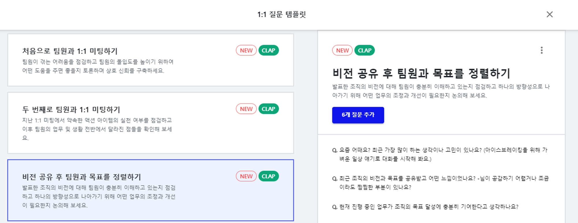 클랩CLAP에서는 1:1 미팅을 통해 목표에 대해 이야기하실 수 있도록 템플릿을 제공하고 있어요. 개인의 업무 비전과 우리 회사 목표를 맞춰보세요.