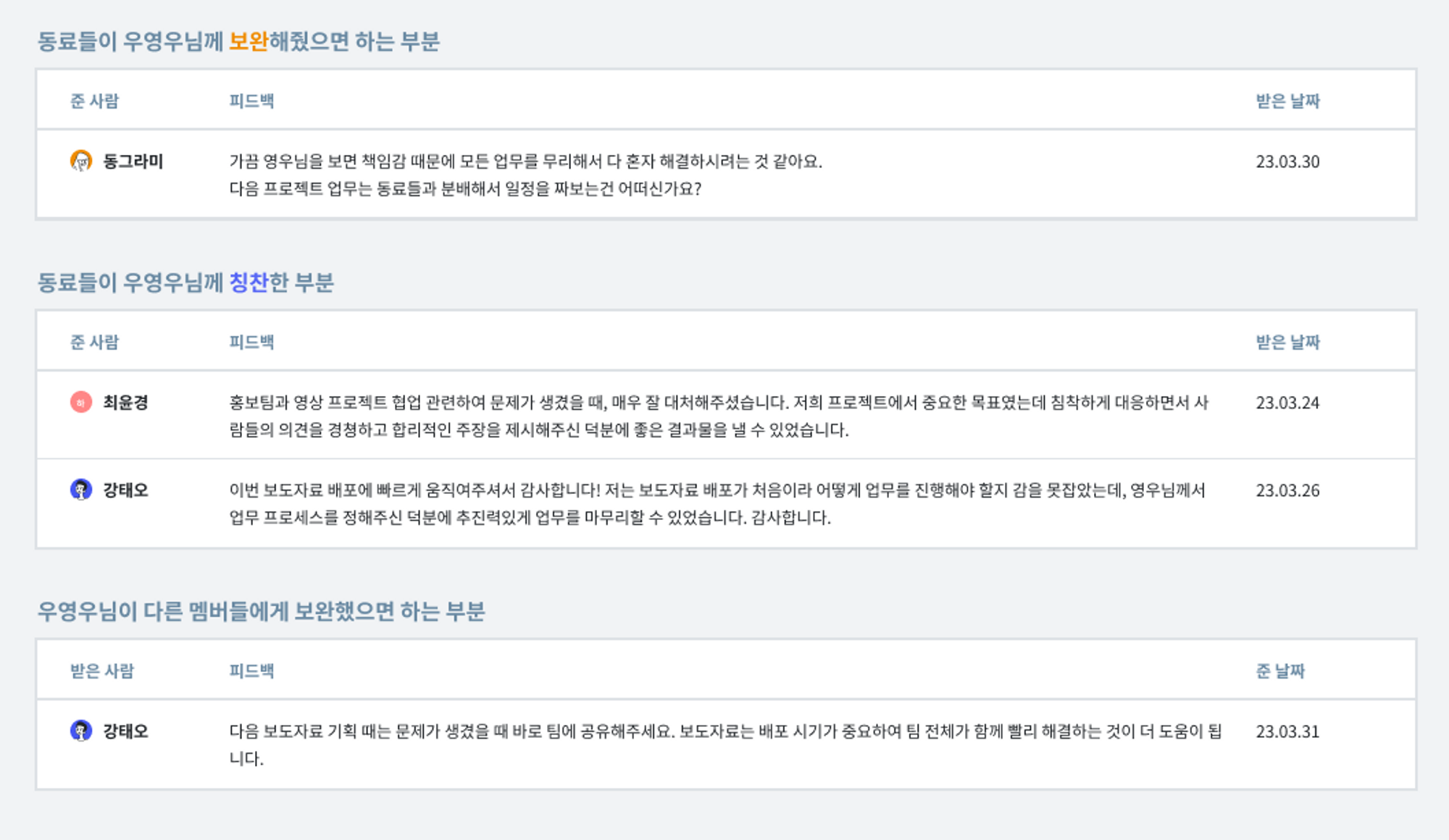 멤버가 동료들로부터 수시로 받은 피드백, 알아서 쌓이니까 리뷰의 구체적 근거로 활용하기에 유용합니다.