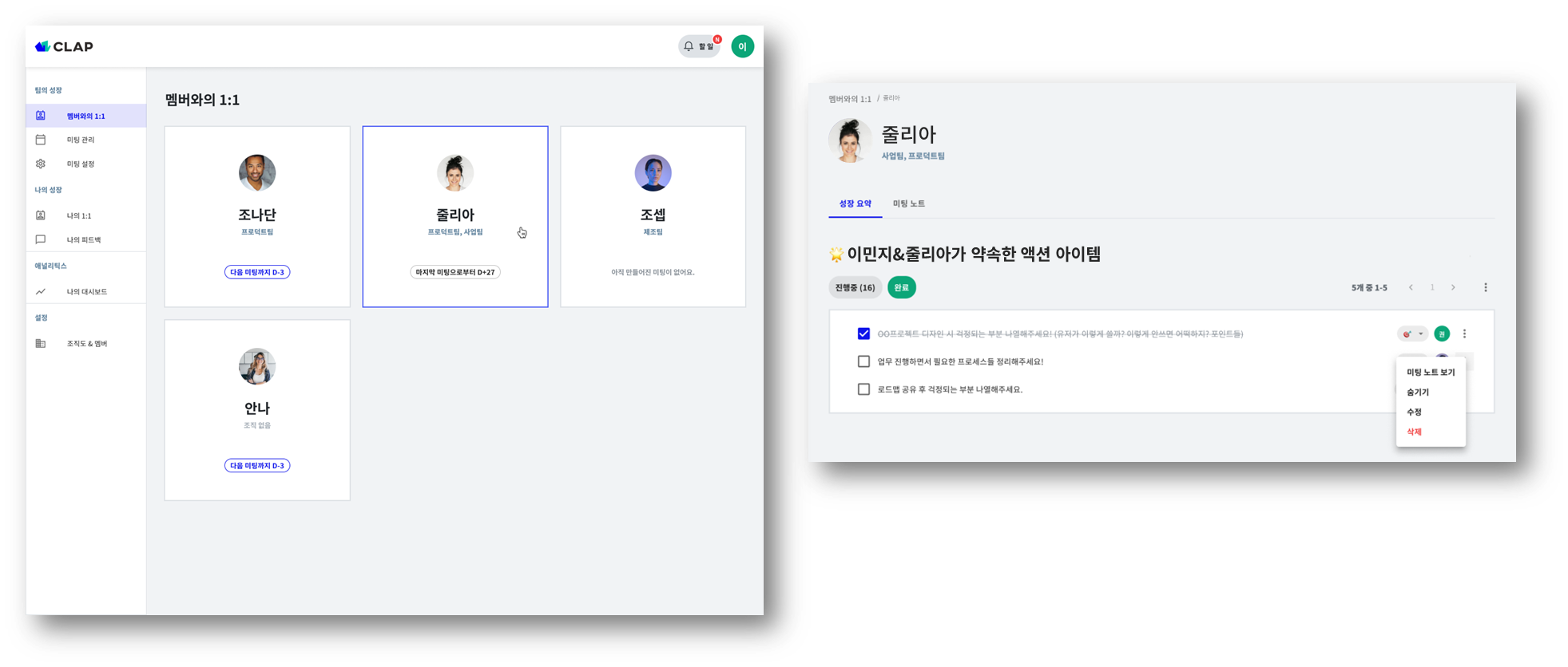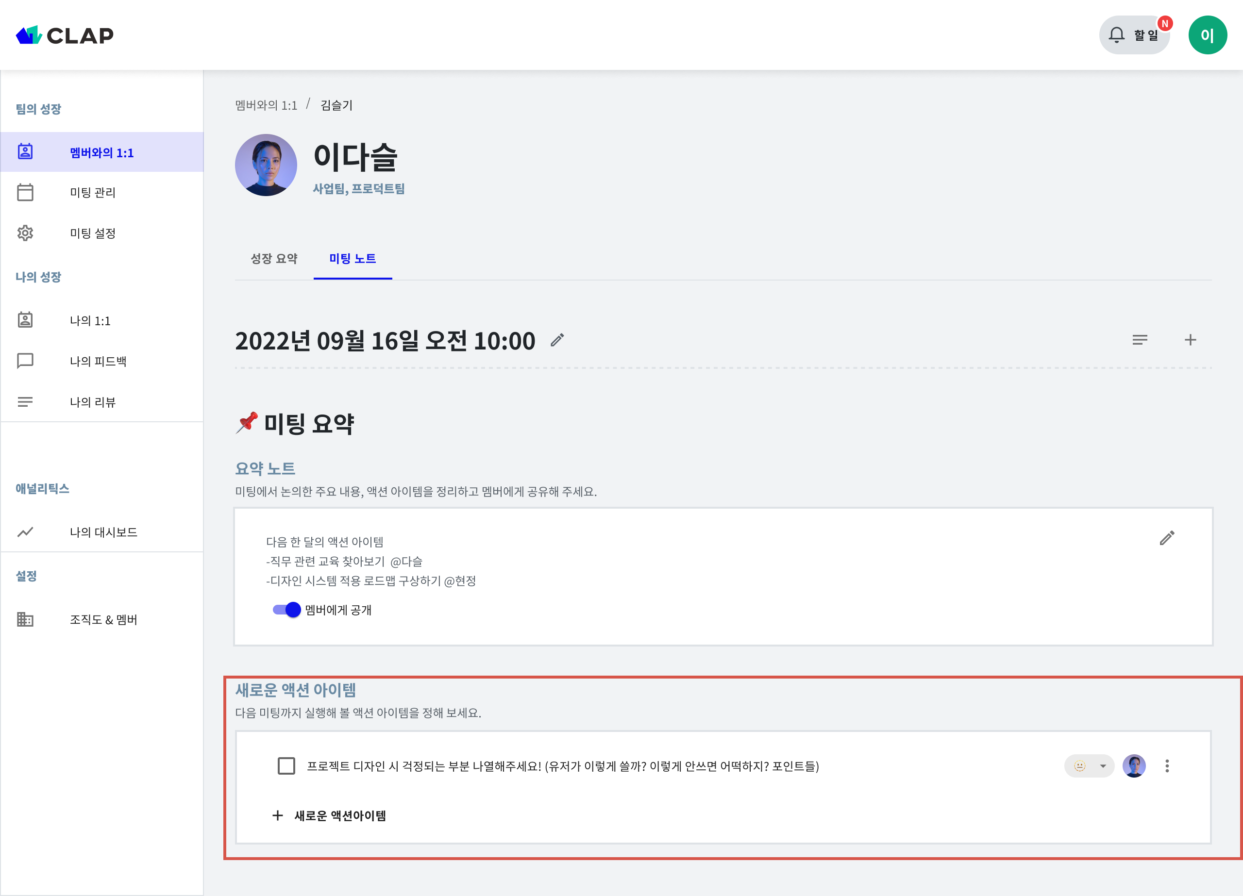 효과적인 1on1 미팅을 도와주는 클랩CLAP에서는 1on1 미팅의 과정에서 액션 아이템이 꼭 설정되고 실천될 수 있도록 여러 기능을 통해 지원하고 있어요.