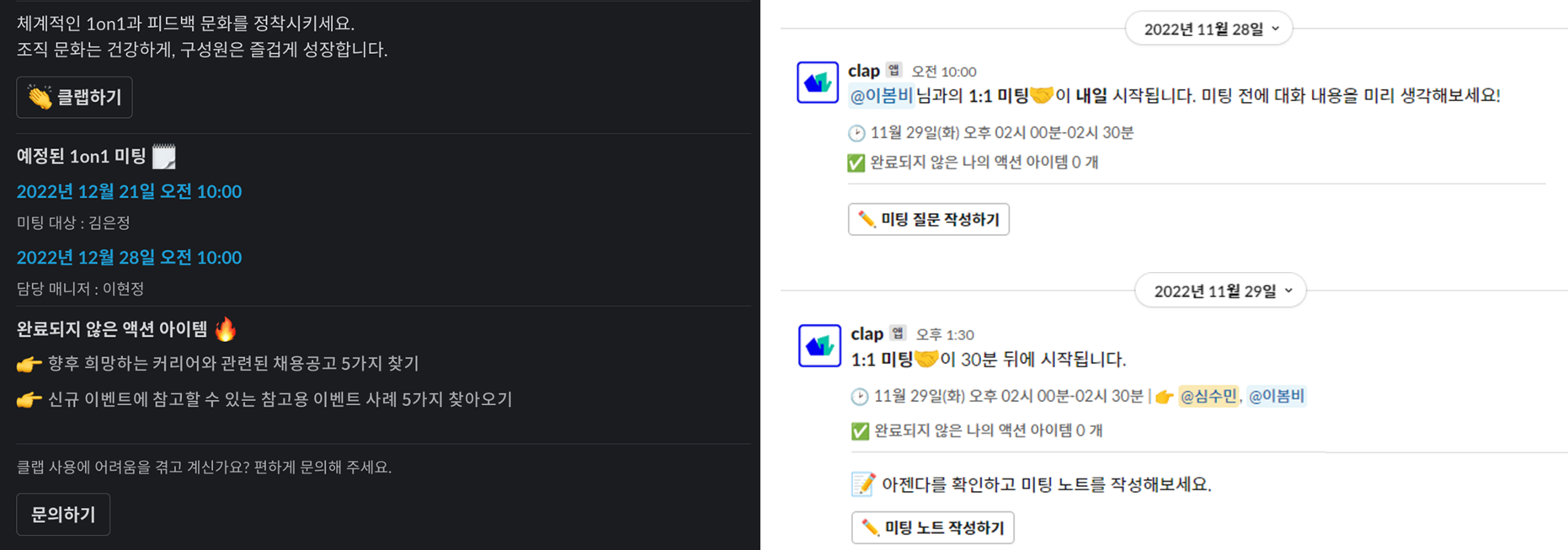 또한 슬랙(Slack)의 클랩앱이 직접적으로 알림도 제공해요. 1on1 미팅의 1일 전 및 30분 전 알림의 하단에 ‘완료되지 않은 나의 액션 아이템’ 개수를 알려드립니다. 이를 통해 1on1 미팅에 참여하기 전, 자신의 액션 아이템을 다시 한 번 확인하고 실천할 수 있어요.