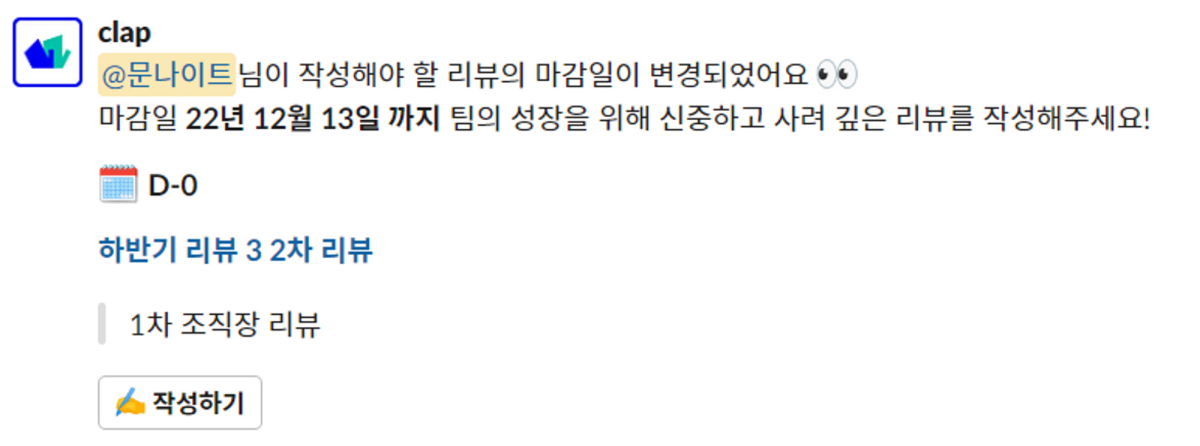 리뷰 미제출자는 마감 5, 3, 1일전 오전에 제출요청 리마인드 알림을 받고 리뷰 생성자는 제출 현황 리포트를 받게됩니다. (슬랙과 이메일로 모두 발송)