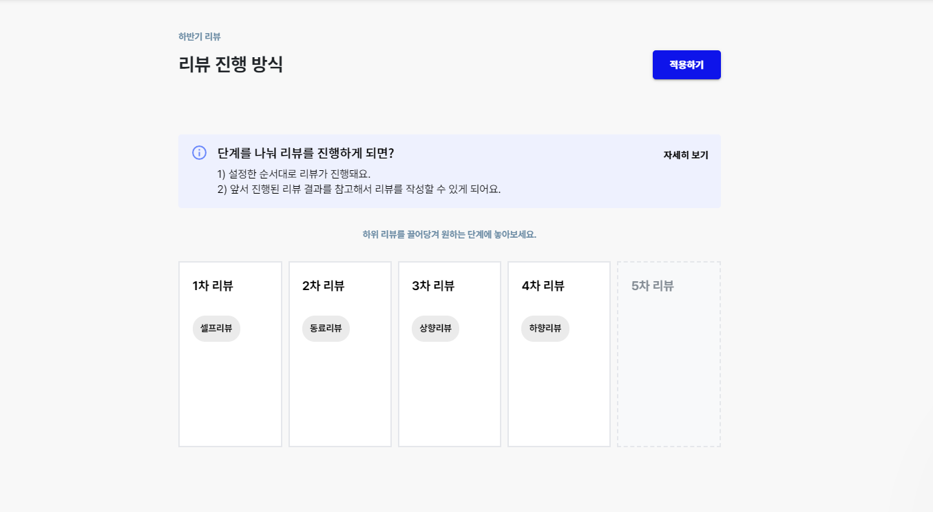 단계별 리뷰 진행, 미제출자 자동 리마인드 알림, 리뷰 결과 공개여부 선택 등 다양해진 옵션들로 우리 조직 상황에 맞게 리뷰를 진행해보세요.