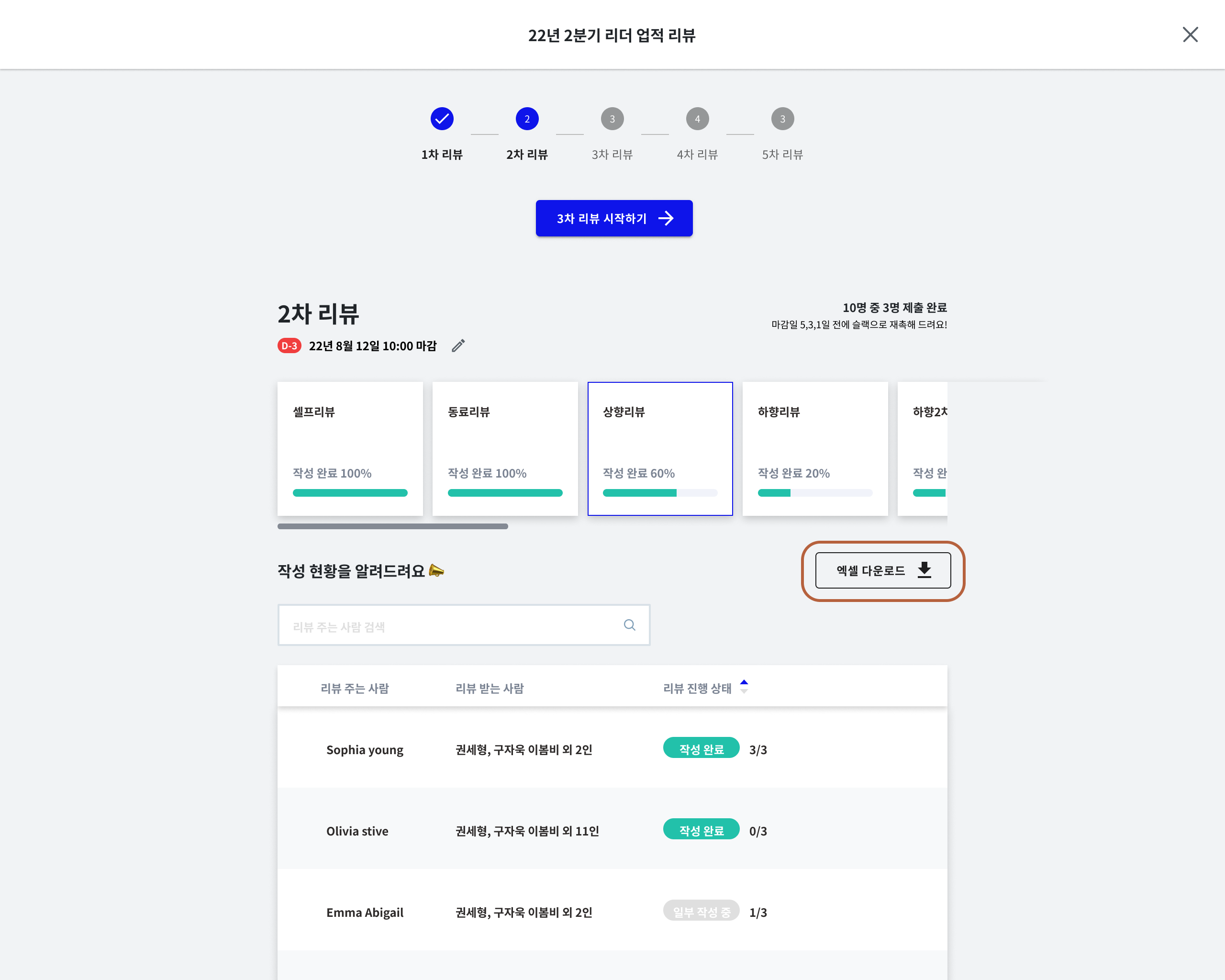 리뷰 기간 중에 제출이 완료된 제출결과는 미리 엑셀로 다운로드 받아서 확인할 수 있습니다.