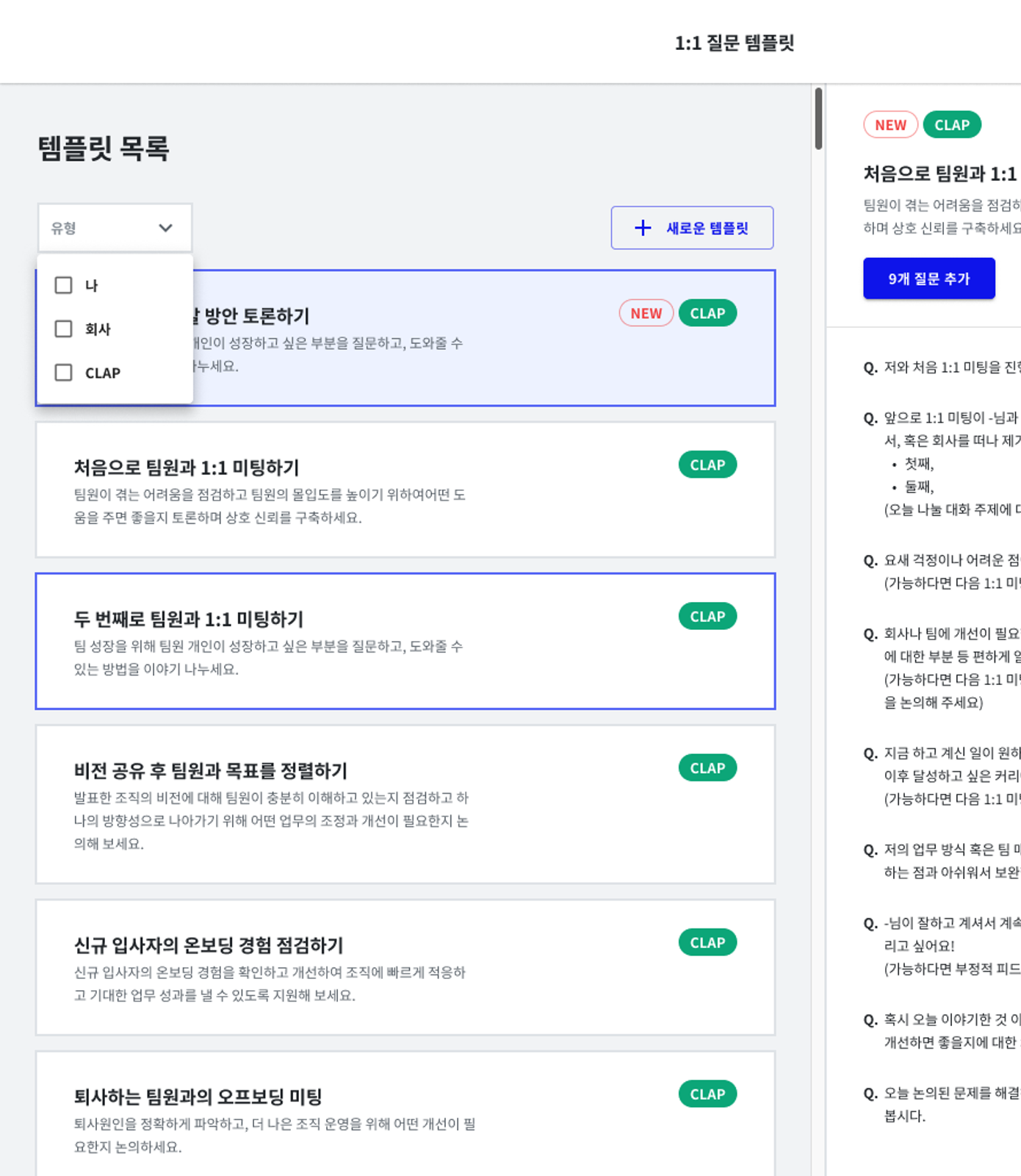 구성원과 어떠한 이야기를 해야할지 막막하시다면? 클랩의 '1on1 템플릿'을 활용해보세요. 코칭이 처음이더라도 질문 리스트를 활용해 손쉽게 코칭에 접근할 수 있어요.