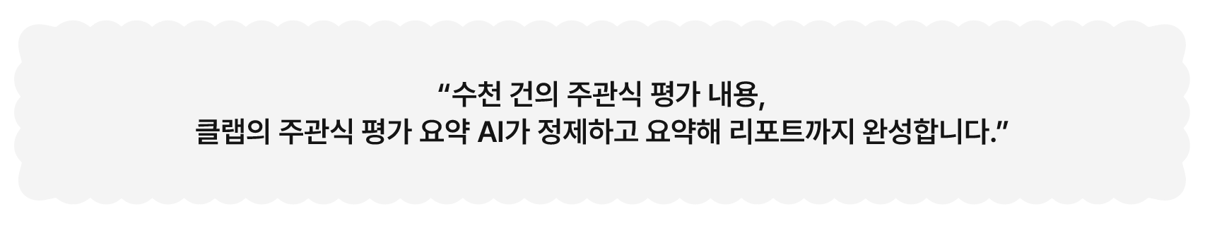 평가 시즌마다 주관식 코멘트를 정제하는 과정에 지치셨다면, 클랩의 주관식 코멘트 요약 AI 기능을 활용해보세요.