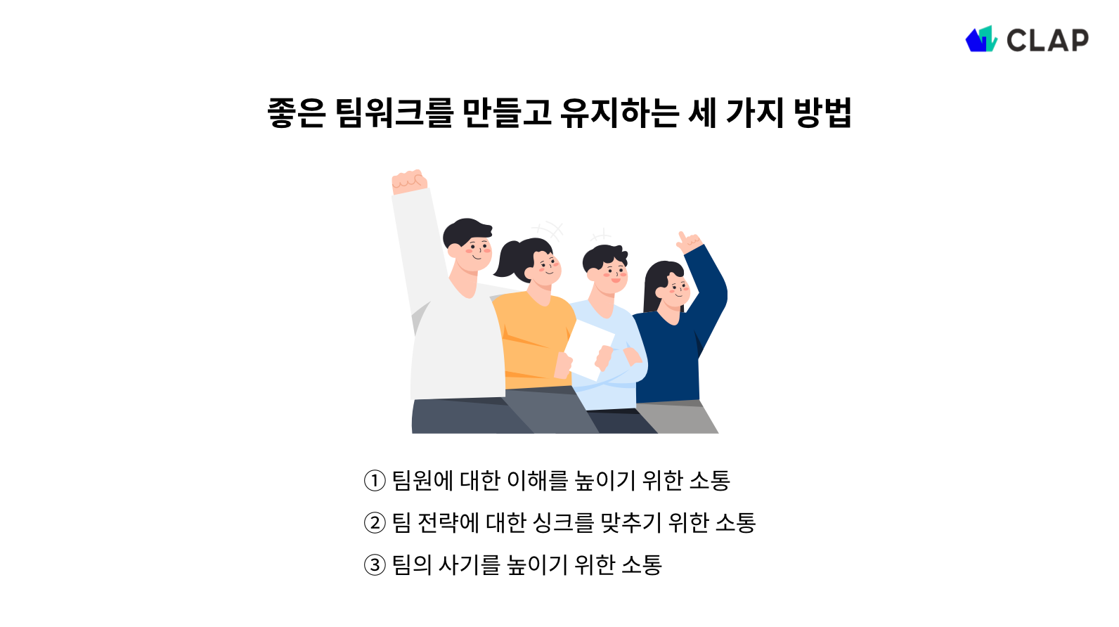 팀워크를 위해 필요한 소통의 종류는 여러 가지가 있는데요, 그 중에서도 ① 팀원에 대한 이해를 높이기 위한 소통, ② 팀 전략에 대한 싱크를 맞추기 위한 소통, ③ 팀의 사기를 높이기 위한 소통이 중요합니다.