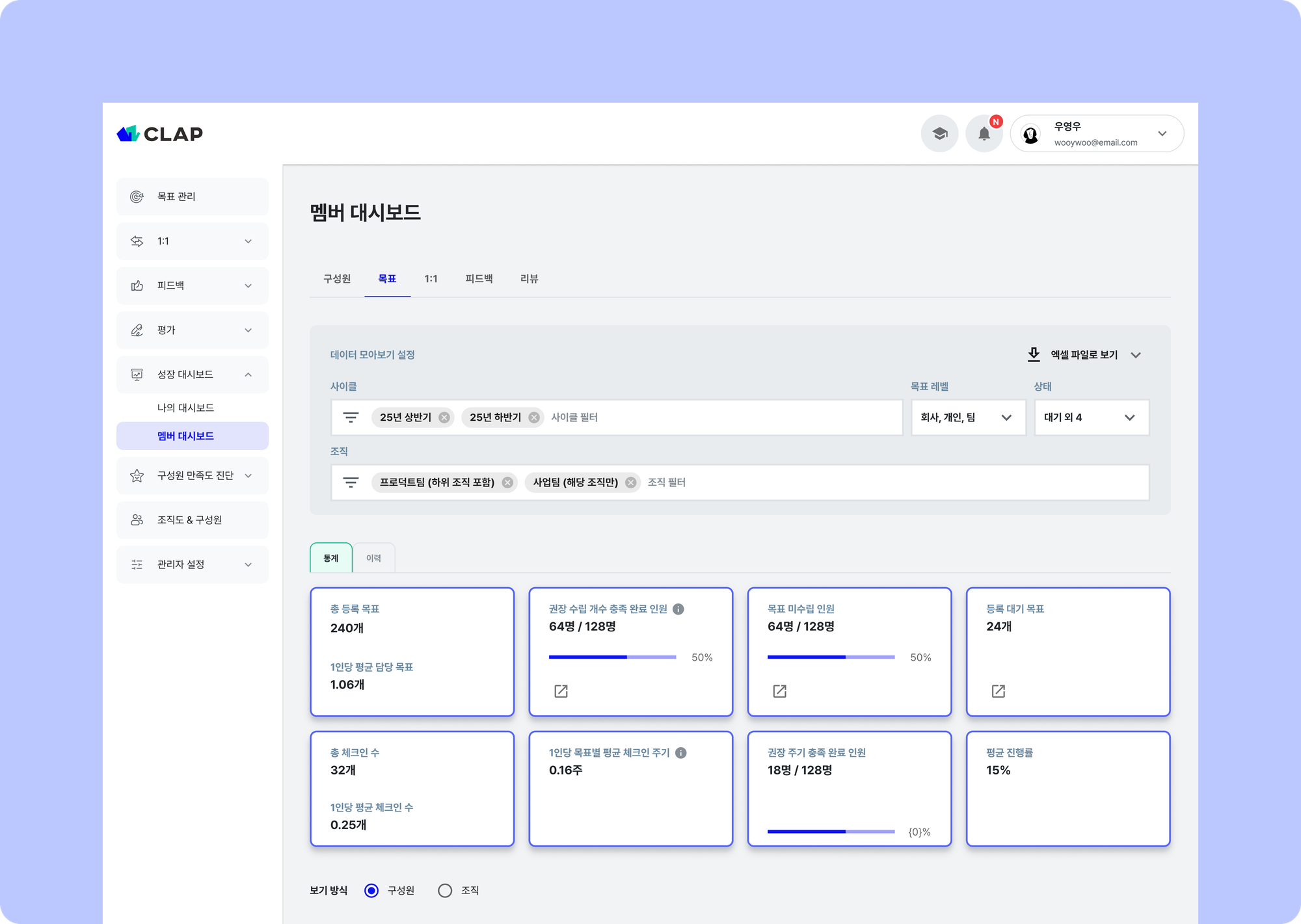 클랩의 성장 대시보드 > 목표 대시보드에서는 목표 수립 현황과 체크인 진행 상황을 요약한 8개의 카드로 한 눈에 파악할 수 있어요.