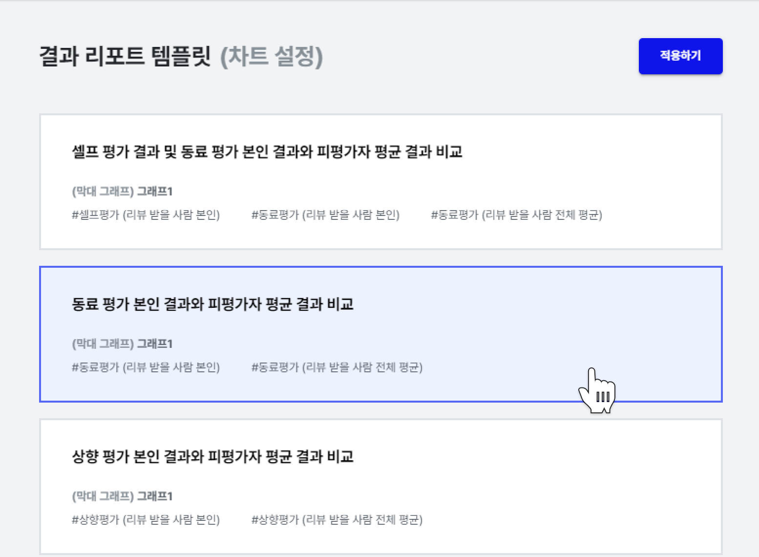 또한, 평가 결과를 비공개로 설정해 둔 경우에는 리포트를 통해 필요한 데이터만 선택적으로 공개할 수 있습니다. 예를 들어, 하나의 하위 리뷰가 등급형과 서술형으로 구성되어 있는 경우, 서술형 답변은 비공개 처리하고 등급형 점수만 리포트에 표시하도록 설정할 수 있습니다. 이 방식은 평가 내용 중 민감하거나 구체적인 데이터를 숨기면서도, 평가의 주요 결과를 투명하게 보여줄 수 있습니다.