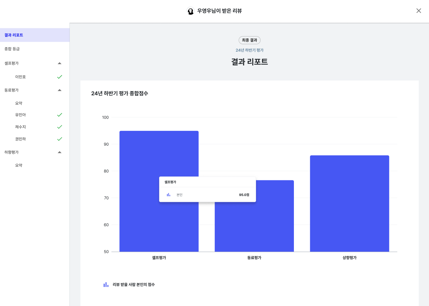 이러한 문제를 해결하기 위해서는 평가 결과를 자동으로 시각화하고, 인사팀과 평가자가 원하는 형태의 리포트를 손쉽게 제공할 수 있는 기능이 반드시 필요합니다. 평가가 끝난 후 보고 싶었던 결과를 한눈에 확인할 수 있는 성과관리 시스템은 평가 프로세스를 단순화하고 피드백 제공의 퀄리티를 높이는 데 큰 도움을 줄 수 있습니다.