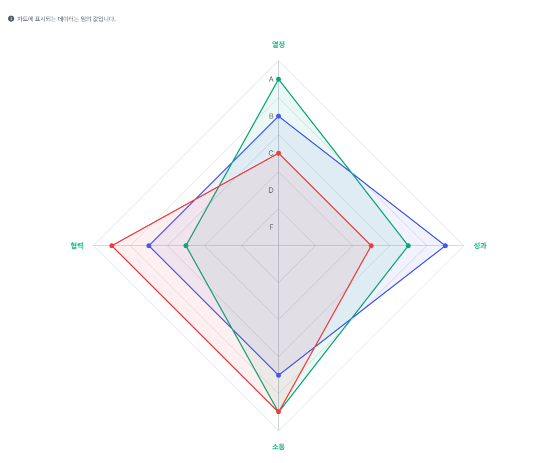 특히 방사형 그래프는 피평가자가 평가 항목별로 자신의 강점과 개선이 필요한 부분을 한눈에 확인할 수 있도록 구성되어 있습니다. 예를 들어, 리더십, 커뮤니케이션, 문제 해결 능력과 같은 역량 항목별 점수를 방사형 차트로 표현하면, 각 역량의 상대적인 수준을 직관적으로 파악할 수 있습니다.