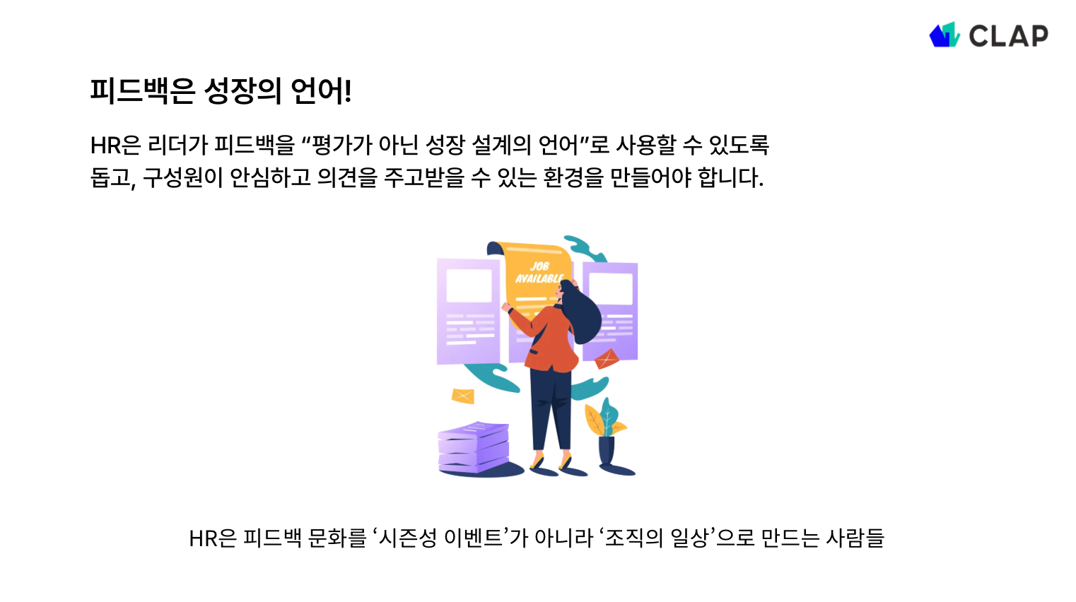 마지막으로, HR의 역할은 이러한 문화를 제도적으로 뒷받침하는 것입니다. HR은 리더가 피드백을 “평가가 아닌 성장 설계의 언어”로 사용할 수 있도록 돕고, 구성원이 안심하고 의견을 주고받을 수 있는 환경을 만들어야 합니다. 이를 위해 HR은 다음과 같은 역할을 수행할 수 있습니다.