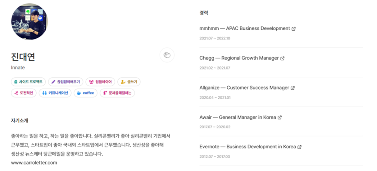 에버노트에서 약 4~5년간 재직 후 Awair, Allganize, Chegg, mmhmm 등 실리콘밸리 소재의 기업에서 근무했어요. Customer Success Manager, Regional Growth Manager 등 다양한 경험을 쌓으며 사업분야 전반에 대한 제너럴리스트로 성장할 수 있었습니다. 그리고 이러한 경험을 살려 현재에는 글로벌을 꿈꾸는 자랑스러운 한국 스타트업, 콜라비의 COO로 재직 중이예요. 개인적으로는 실리콘밸리에서 재직하며 ‘생산성’에 대한 고민을 많이 하게 되어 생산성 뉴스레터 <당근메일>을 만들고, 생산성 커뮤니티 <판사스틱>도 운영하고 있어요.