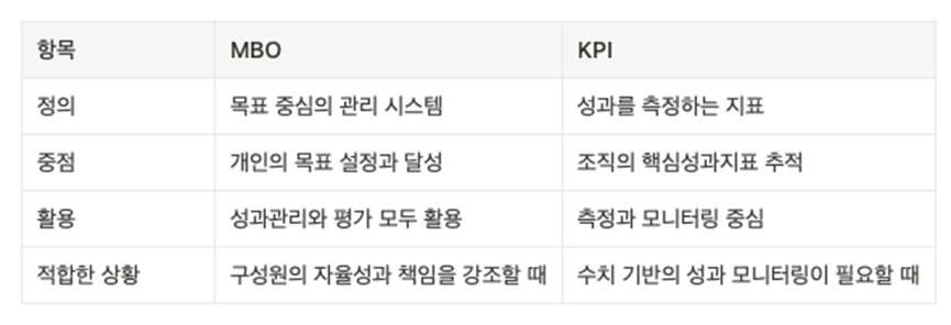 MBO와 KPI, OKR의 차이점은 위와 같으며 MBO는 '목표 기반의 관리 시스템'이라는 점에서 KPI/OKR보다 넓은 범위의 개념입니다.