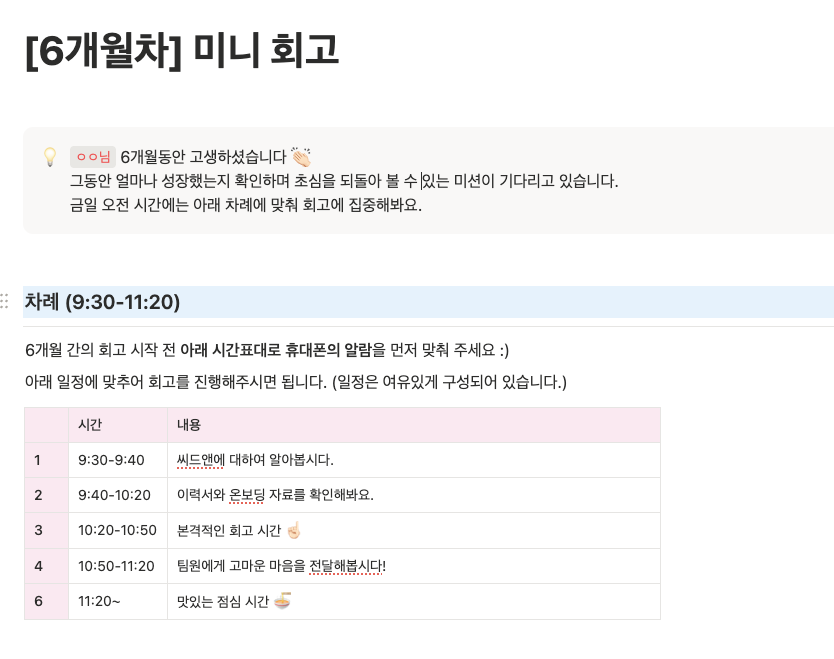 여기에 인사팀장 원온원과 소속 팀장 원온원을 함께 진행하며 역할 기대치와 실제 경험 사이의 간극을 조정하고 있습니다. ‘씨드앤(회사명) 팀원으로 거듭나기’라는 이름의 각 월별 회고는 신규 입사자가 자신의 성장과 어려움을 기록하는 시간이며 온보딩 프로그램이 일방적인 평가로 끝나지 않도록 돕는 장치입니다.