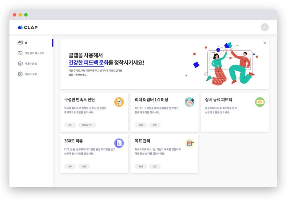 CLAP을 활용한다면, 상시 동료 피드백으로 자연스럽게 사내 성장을 위한 피드백 문화가 자리 잡으며, 회사와 모든 직원들 간에 정기적인 1:1미팅을 진행하는 것이 보다 수월하게 진행됩니다. CLAP을 통해 피드백 문화부터, 360도 리뷰까지 직원의 성장을 응원하고 기록하세요.