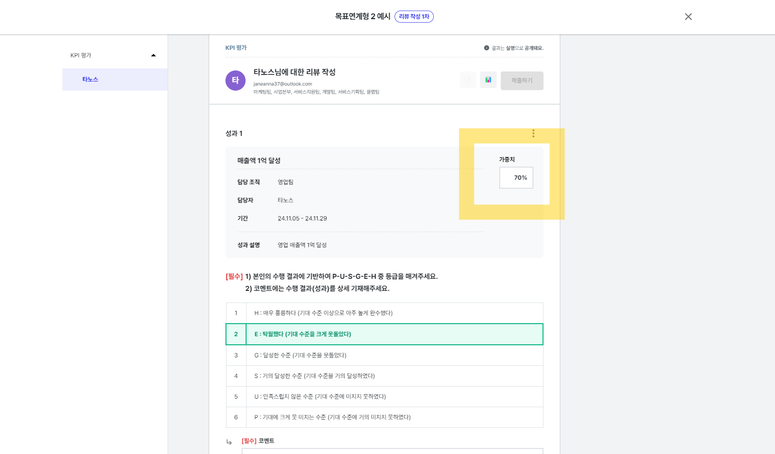 게다가, 클랩에서는 목표에 대한 가중치를 설정하는 것만으로 자동으로 평가 점수가 산출됩니다. 예를 들어, 목표에 대한 달성도를 평가한 뒤 아래와 같이 가중치를 입력하면, 그에 맞는 등급이 자동으로 계산됩니다.