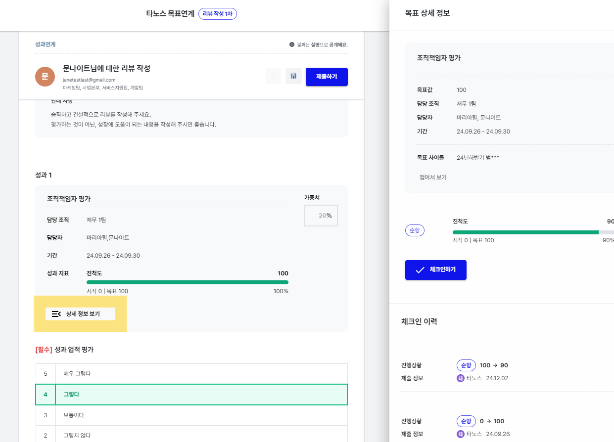 그렇다면 구성원들은 자신의 성과를 입력하는 수고로움이 크게 줄어듭니다. 보통 성과 평가에서는 각자가 자신의 성과를 정리하고 제출하는 과정이 필요하지만, 클랩에서는 목표 내용을 불러오기만 하면 끝입니다. 이로 인해 수동으로 데이터를 입력하거나 반복적인 작업을 할 필요가 없어져 시간이 절약되죠.