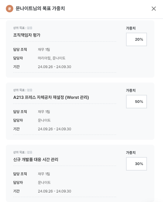 입력된 성과별 가중치 설정 역시 가능합니다. 피평가자가 입력한 가중치를 확인 후 1차 및 2차 평가자가 이를 수정할 수 있어 손쉽게 최종 가중치 반영을 할 수 있습니다.