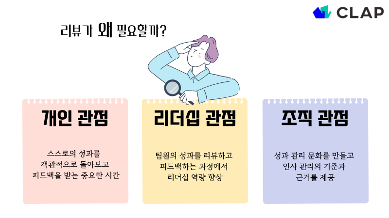 개인 성과가 개선되면 팀의 성과도 향상되기에 리뷰는 팀 차원에서도 당연히 중요합니다. 한 가지 더 중요한 포인트가 있습니다. 리더십의 성장입니다. 리더는 팀원의 성과를 리뷰하고 피드백하는 과정에서 리더십의 성장을 경험합니다. 리뷰는 생각할거리도 많고 시간도 많이 투자해야 하는 쉽지 않은 과정인데요. 팀원 한 명 한 명의 성과를 검토하고 성장을 위한 피드백을 진행하면서 리더의 영향력은 커지고 리더십 역량도 향상될 수 있습니다.