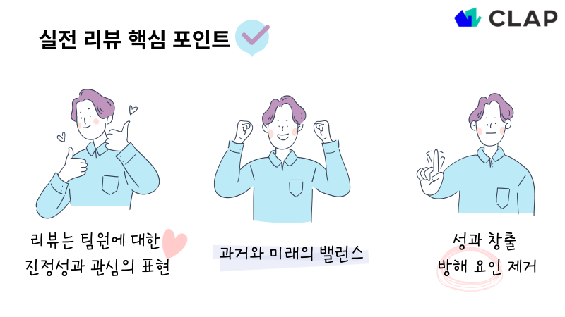 리더의 피드백은 팀원에게 보내는 메시지입니다. 팀원에 대한 관심의 표현이며 팀원의 성장을 바라는 진정성의 표현이기도 하죠. 사전 준비를 어떻게 하느냐에 따라 리뷰의 퀄리티가 달라집니다. 팀원들의 주요 성과, 개선이 필요한 점, 하반기 기대하는 점은 무엇인지 그동안 관찰한 결과들을 사전에 미리 준비하여 리뷰를 진행해야 종합적이고 풍부한 피드백을 남길 수 있습니다.